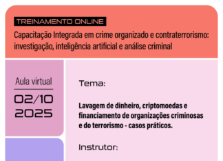 Capacitação Integrada em crime organizado e contraterrorismo: investigação, inteligência artificial e análise criminal" Programação Data: 02/10, quinta-feira Horário: 14h30 às 17h (horário de Brasília) Formato: virtual Tema: Lavagem de dinheiro, criptomoedas e financiamento de organizações criminosas e do terroristas...